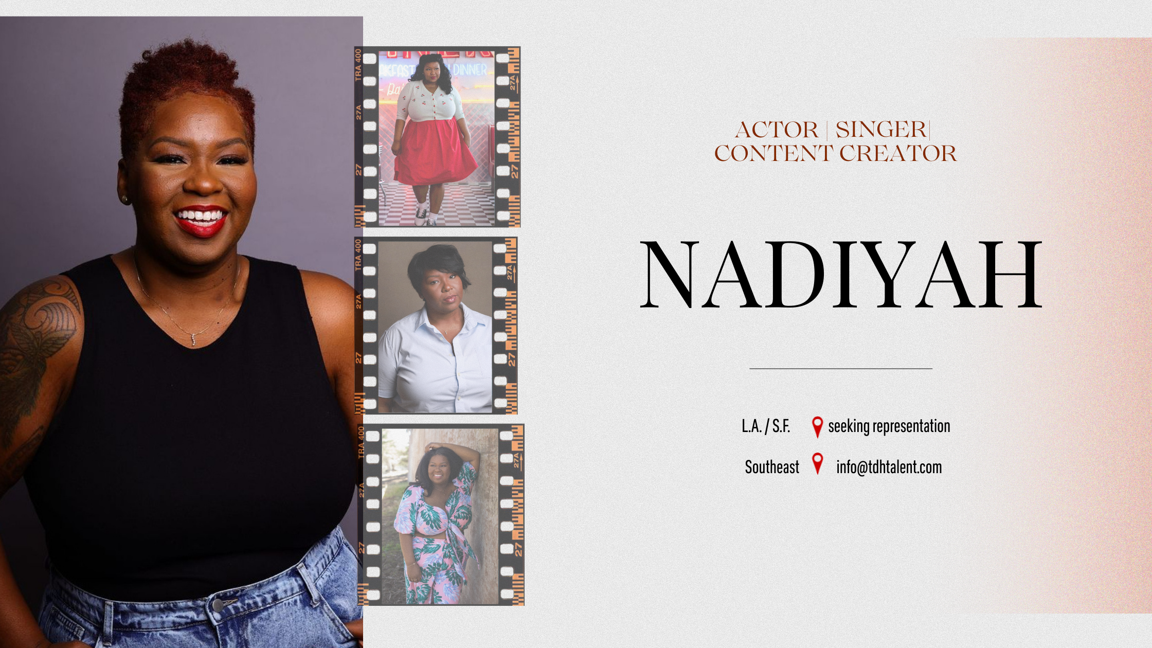 Nadiyah is represented by TDH Talent Unlimited (GA) and seeking representation in CA.